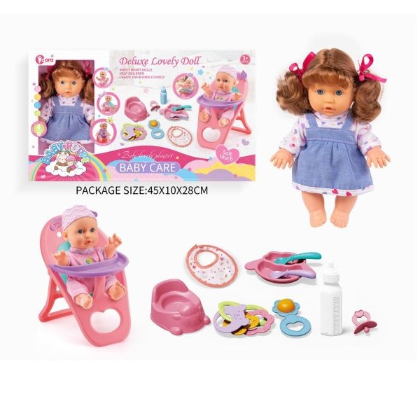Κούκλα μωρό, που λέει \"μαμά\" και \"μπαμπά\", γελάει και κλαίει. Με καρεκλάκι και σκεύη φαγητού, μπιμπερό, σαλιάρα, πιπίλα, κουδουνίστρες, μασητικά και γιογιό. Αφού φάει, κάνει πιπί.
