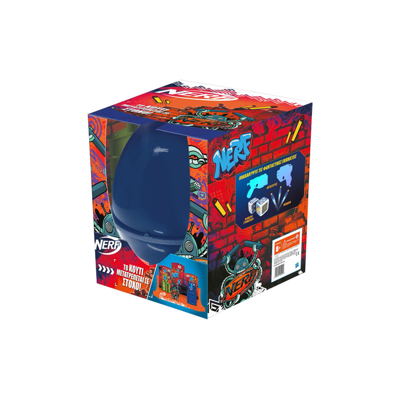 Hasbro Αυγό Έκπληξη Nerf. Ανακαλύψτε τις φανταστικές εκπλήξεις που κρύβει το Αυγό Έκπληξη της Nerf το οποίο μετατρέπεται σε στόχο και ξεδιπλώνεται ο μαγικός κόσμος της δράσης, όπου μπορούν τα παιδιά να παίζουν ατελείωτες ώρες. Η συσκευασία περιέχει: 1 συσκευασία βελάκια Nerf (Κωδικός F0040), 1 Nerf όπλο Trio TD 3 (Κωδικός Ε9954), 1 Nerf ξυπνητήρι, 1 σετ Nerf αυτοκόλλητα και 1 Nerf Alfa Strike Claw QS (Κωδικός F2218).
