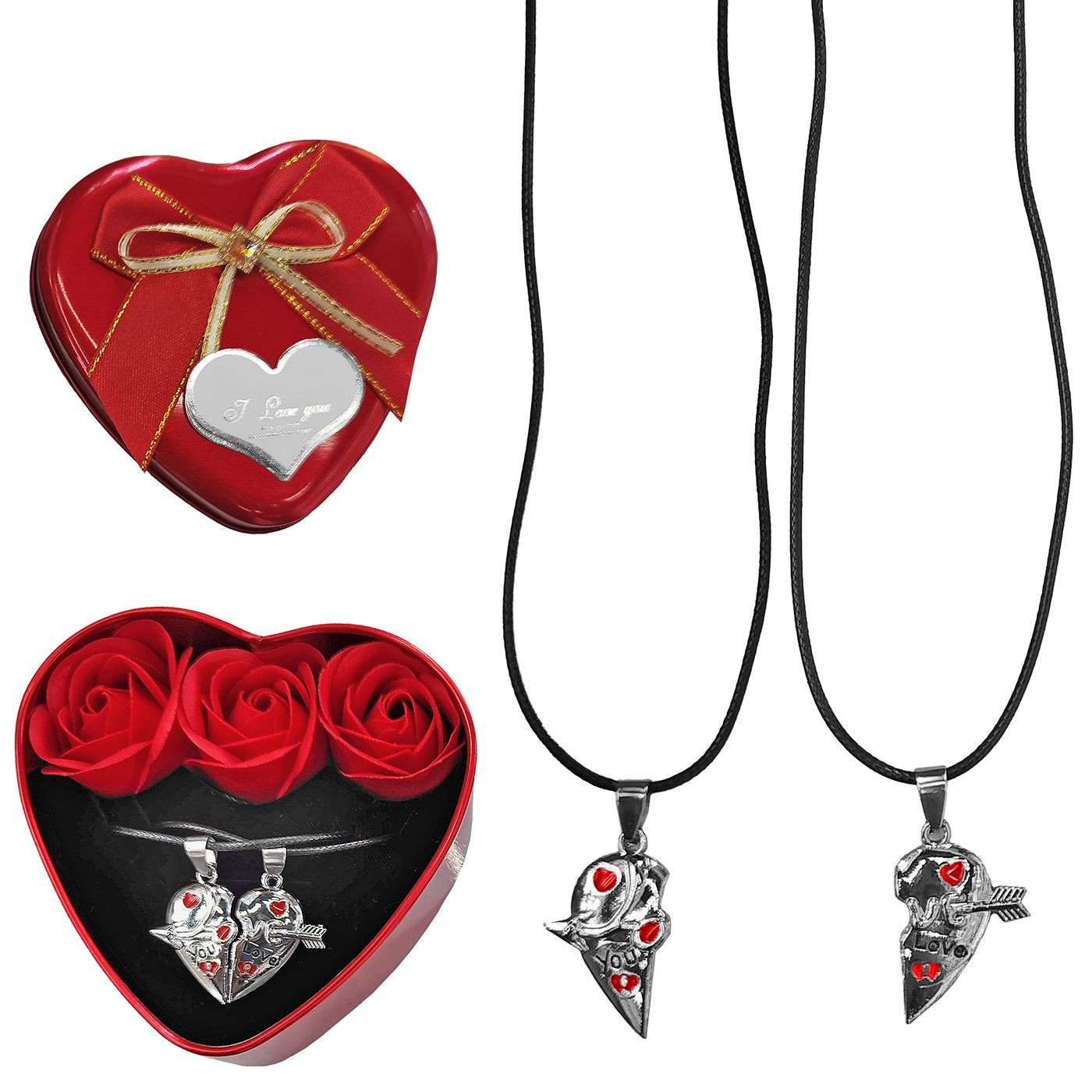 Κουτί καρδιά με 3 τριαντάφυλλα & 2 κολιέ 9x9x4,5cm