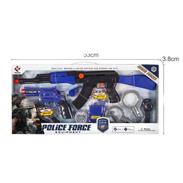 Παιχνίδι σετ αστυνομικού, με 2 όπλα, ασύρματο, χειροπέδες, σήμα, σφυρίχτρα και ρολόι.
