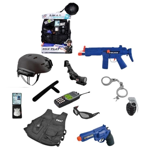 Παιχνίδι σετ Αστυνομικού SWAT. Περιλαμβάνει γιλέκο, 2 όπλα, κράνος, κλομπ, φακό, γυαλιά, χειροπέδες, χειροβομβίδα, ασύρματο και σήμα.