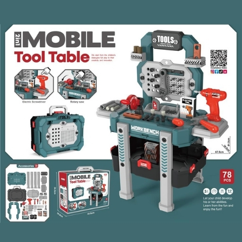 Παιδικός πάγκος εργασίας με ηλεκτρικό κατσαβίδι, σφυρί, κλειδιά και πολλά ακόμα εργαλεία, που μετατρέπεται σε βαλιτσάκι για εύκολη αποθήκευση και μεταφορά.