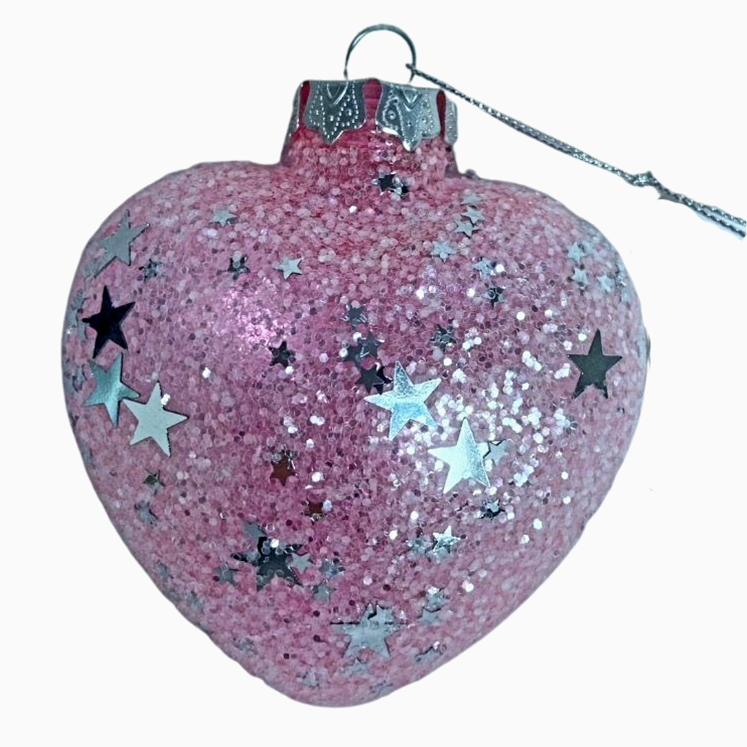 Χριστουγεννιάτικο Στολίδι Δέντρου Καρδιά Ροζ Glitter Ασημί Αστέρια 8x9cm